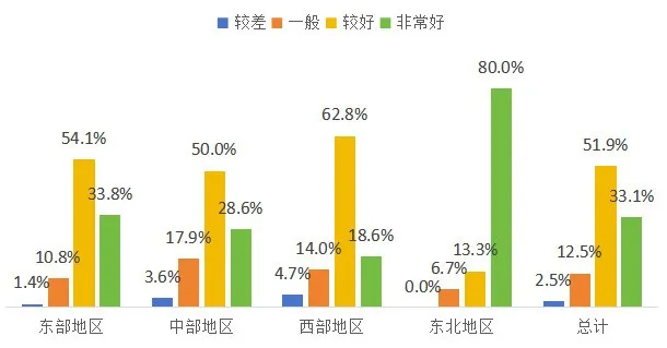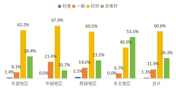 工作人員整體服務(wù)態(tài)度較好,政策熟悉度較高。總體看,超過85%的熱線服務(wù)態(tài)度較好,對(duì)咨詢的問題能正確回應(yīng),耐心解答,對(duì)政策和業(yè)務(wù)流程講解清晰。相較而言,東部、東北地區(qū)工作人員服務(wù)態(tài)度、政策熟悉度較好。仍存在部分咨詢熱線接聽人員沒耐心、不清楚辦理流程等情況。