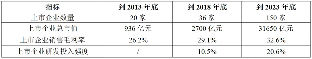 資本市場(chǎng)助力產(chǎn)業(yè)升級(jí),上市企業(yè)數(shù)量質(zhì)量雙飛躍。根據(jù)東方財(cái)富金融數(shù)據(jù)統(tǒng)計(jì)(表4),截止到2013年底,我國實(shí)現(xiàn)A股上市的半導(dǎo)體企業(yè)僅有20家,總市值不足千億元,平均銷售毛利率26.2%。而到2023年底,上市企業(yè)數(shù)量超過150家,總市值超過3萬億元,平均銷售毛利率32.6%。尤其是2018-2023年,由于科創(chuàng)板的設(shè)立,帶動(dòng)集成電路產(chǎn)業(yè)在資本市場(chǎng)實(shí)現(xiàn)“加速跑”,5年間上市企業(yè)數(shù)量和總市值分別實(shí)現(xiàn)超過4倍和10倍的增長(zhǎng),上市企業(yè)平均銷售毛利率和研發(fā)投入強(qiáng)度也實(shí)現(xiàn)大幅躍升。