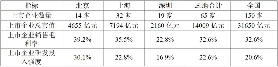 在企業(yè)發(fā)展方面,北京上市企業(yè)發(fā)展質(zhì)量最高,上海上市企業(yè)數(shù)量和總市值最多。根據(jù)東方財(cái)富數(shù)據(jù)(表7),截止到2023年底,北京、上海、深圳分別擁有14家、32家、19家半導(dǎo)體領(lǐng)域的上市企業(yè),總市值分別為4655億元、7194億元、2160億元,合計(jì)上市企業(yè)數(shù)量和總市值占到全國的40%以上。其中上海上市企業(yè)的數(shù)量和總市值最多,而北京的上市企業(yè)發(fā)展質(zhì)量最高,銷售毛利率和研發(fā)投入強(qiáng)度分別達(dá)到39.2%和30.1%,遠(yuǎn)超全國平均水平。