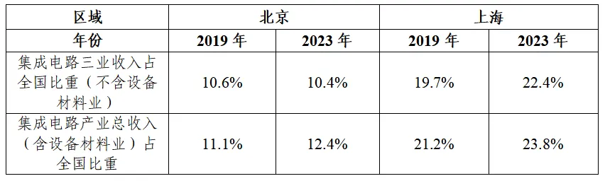 表3 2019年和2023年北京、上海的集成電路產業各環節占全國比重的對比(億元)