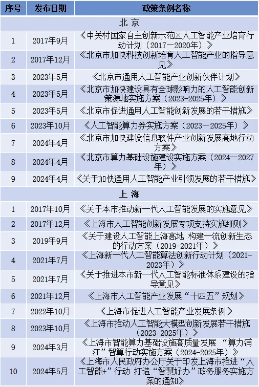 一、上海、北京發布人工智能產業政策數量領先,上海政策類型最為豐富