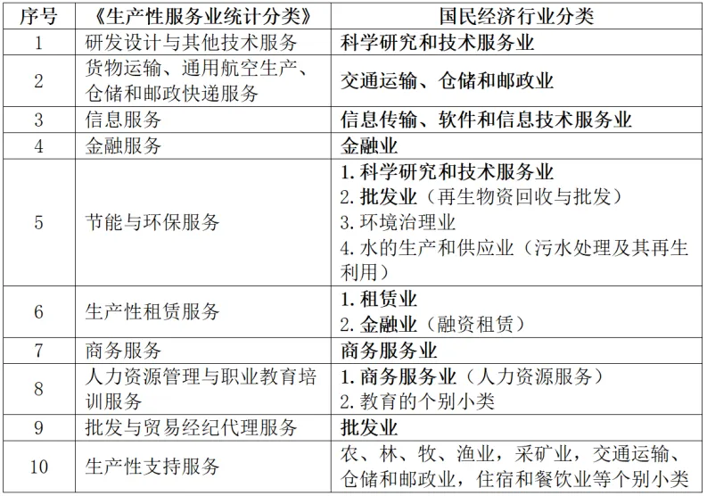 生產性服務業著重發展十大領域。2019年,國家統計局對《生產性服務業分類(2015)》進行修訂完善,印發《生產性服務業統計分類(2019)》,明確生產性服務業共有十大類,即研發設計與其他技術服務,貨物運輸、通用航空生產、倉儲和郵政快遞服務,信息服務,金融服務,節能與環保服務,生產性租賃服務,商務服務,人力資源管理與職業教育培訓服務,批發與貿易經紀代理服務,生產性支持服務。