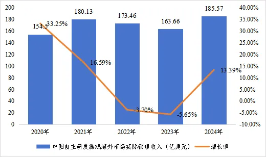 圖 1 近五年中國自主研發游戲海外市場實際銷售收入及增速