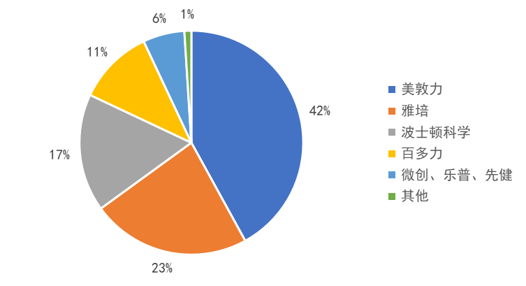腦血管介入器械(又稱神經介入器械)是指治療中樞神經系統血管疾病的微創醫療器械。美敦力作為全球腦血管介入器械行業的引領者,進入中國市場20余年,以其全球領先的高技術產品占據國內60%市場份額。而國內品牌如微創神通、心瑋醫療、沛嘉醫療、歸創通橋等多以生產微導管類、微導絲類等通路類產品為主。