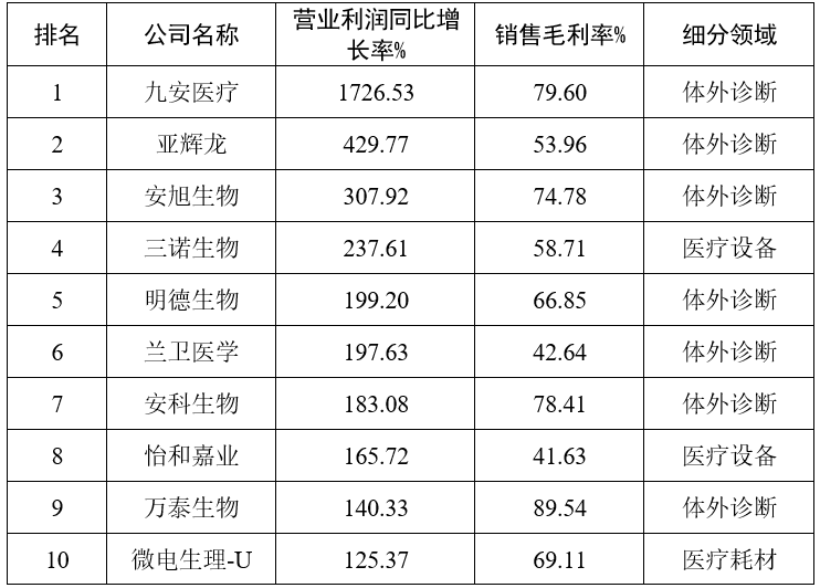 (二)醫療器械行業利潤分化,體外診斷表現突出,醫用耗材下滑明顯,醫療設備保持穩定增長 與此同時,行業毛利率繼續維持高位,利潤領域分化也愈發明顯。2022年行業銷售毛利率達53.9%,其中體外診斷領域營業利潤同比增長明顯,行業前10名中有8家屬于體外診斷領域。 表2 2022年我國醫療器械上市企業利潤增長率TOP10