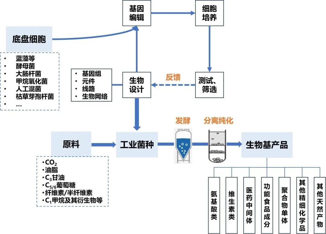 結(jié)合合成生物制造流程來看,其本質(zhì)就是“細(xì)胞工廠”,通過基因技術(shù)編輯底盤細(xì)胞,將生物碳基原料置于底盤細(xì)胞中進(jìn)行發(fā)酵,之后采用多種技術(shù)將發(fā)酵產(chǎn)品從發(fā)酵液或者細(xì)胞中分離、純化出來,在達(dá)到特定標(biāo)準(zhǔn)后制成產(chǎn)品。更通俗地理解,底盤細(xì)胞相當(dāng)于奶牛,各種原料相當(dāng)于低價(jià)值的草料,通過改造優(yōu)化過的底盤細(xì)胞,添加低廉原料后經(jīng)過發(fā)酵等一系列工藝產(chǎn)生的高價(jià)值的化學(xué)或生物產(chǎn)品。