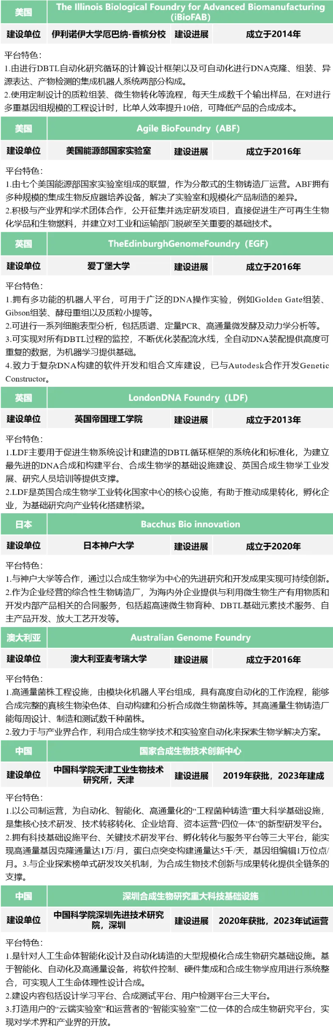 結合國際合成生物設施聯盟(Global Biofoundry Alliance,GBA)成員單位及設施平臺布局情況,本文重點梳理了全球8個代表性合成生物自動化設施的建設及運行情況(詳見文后)。