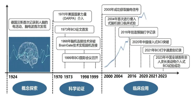 腦機(jī)接口在醫(yī)療領(lǐng)域的應(yīng)用是其發(fā)展的第一推動(dòng)力,目前主要經(jīng)歷了概念探索、科學(xué)論證和臨床應(yīng)用3個(gè)階段。1924年,腦電波的首次發(fā)現(xiàn)為大腦研究奠定了基礎(chǔ)。1970年,美國(guó)組建團(tuán)隊(duì)開(kāi)始進(jìn)行腦機(jī)接口相關(guān)研究,各國(guó)團(tuán)隊(duì)也相繼開(kāi)展探索,實(shí)現(xiàn)了刺激范式、腦機(jī)連接等技術(shù)突破。進(jìn)入21世紀(jì)后,隨著科學(xué)論證的不斷完善、神經(jīng)科學(xué)與相關(guān)技術(shù)的不斷突破,各國(guó)紛紛開(kāi)展腦機(jī)接口的戰(zhàn)略布局,侵入式BCI技術(shù)和非侵入式BCI技術(shù)都有了較大的進(jìn)展,如2004年實(shí)現(xiàn)了通過(guò)侵入式腦機(jī)接口控制機(jī)械臂,2019年非侵入式解碼器將大腦信號(hào)轉(zhuǎn)化為語(yǔ)音信號(hào)。相關(guān)專利量、論文發(fā)表量呈現(xiàn)爆發(fā)性增長(zhǎng),涌現(xiàn)了Neuralink等一批初創(chuàng)公司,概念應(yīng)用產(chǎn)品相繼推出。此外,隨著認(rèn)知/協(xié)同BCI等新范式的不斷涌現(xiàn),其應(yīng)用也從臨床醫(yī)學(xué)向娛樂(lè)游戲、汽車(chē)等多元化領(lǐng)域拓展,逐漸形成產(chǎn)業(yè)化趨勢(shì)。