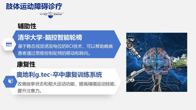 當(dāng)前的研究和應(yīng)用多為非侵入式,主要分為輔助性和康復(fù)性兩類,是業(yè)界進(jìn)展相對(duì)較快的領(lǐng)域。輔助性BCI著重于替代或增強(qiáng)物理功能,通過(guò)捕捉患者的運(yùn)動(dòng)意圖,進(jìn)而控制外部設(shè)備如假肢或外骨骼等。康復(fù)性BCI則專注于通過(guò)神經(jīng)康復(fù)訓(xùn)練恢復(fù)或改善患者的運(yùn)動(dòng)能力,利用中樞神經(jīng)系統(tǒng)的可塑性,通過(guò)重復(fù)性刺激來(lái)強(qiáng)化神經(jīng)元之間的突觸連接,促進(jìn)修復(fù)。