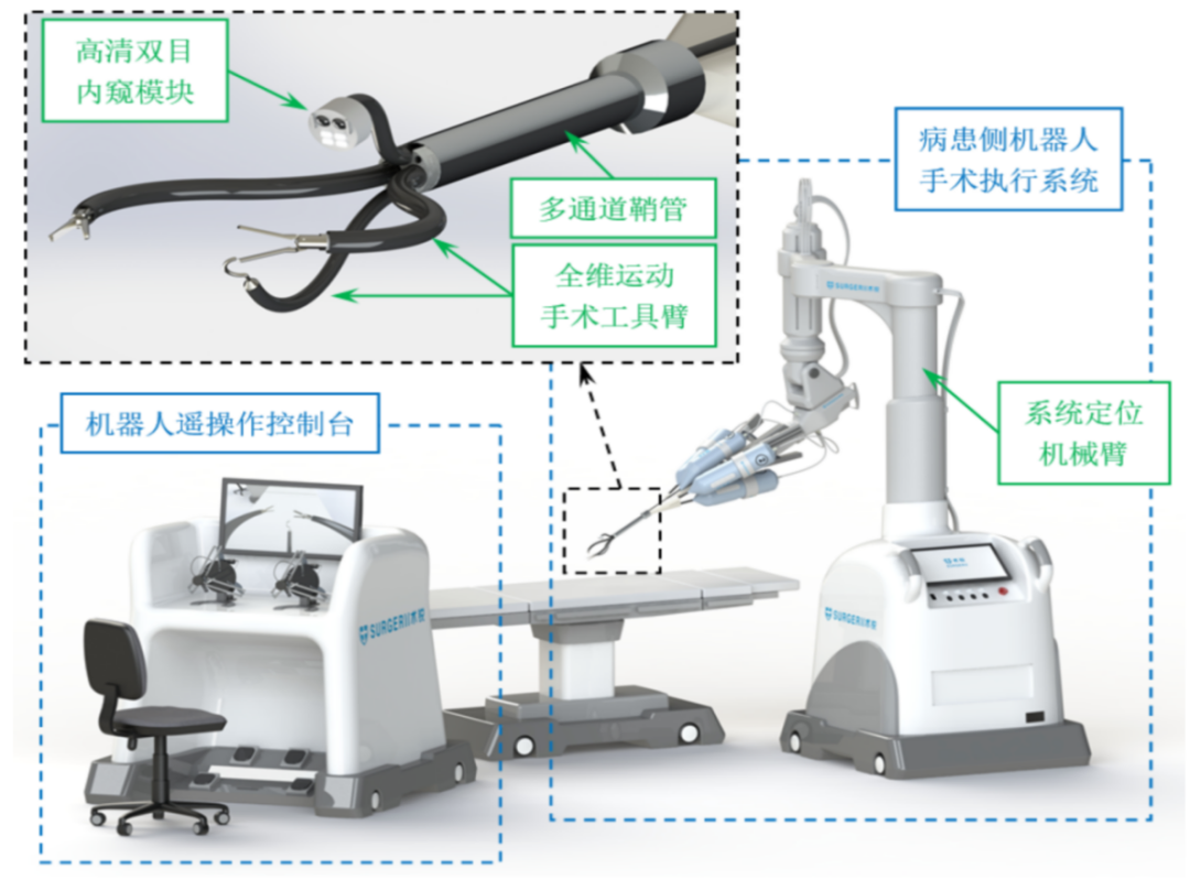 手術(shù)機器人主要包括操作控制臺、機械臂系統(tǒng)、成像系統(tǒng)、動力與傳感系統(tǒng)等核心部件。操作控制臺作為醫(yī)生與機器交互的核心平臺,是機器人的“大腦”;機械臂直接接觸患者,是機器人的“雙手”;成像系統(tǒng)具有3D立體視覺、熒光導(dǎo)航、影像融合功能,是機器人的“眼睛”;動力與傳感系統(tǒng)決定了操作精度、安全性和人機交互能力,是機器人的“心臟與神經(jīng)”。