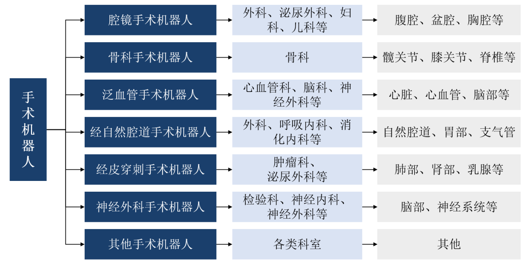 根據(jù)臨床場景,主要分為腔鏡、骨科、泛血管、經(jīng)自然腔道、經(jīng)皮穿刺、神經(jīng)外科手術(shù)機器人等。