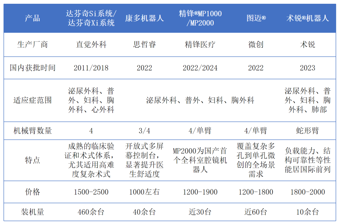 截至目前,國內(nèi)累計獲批超10款,包括達(dá)芬奇Si和達(dá)芬奇Xi、思哲睿康多、精鋒MP1000、微創(chuàng)圖邁、術(shù)銳®機器人等,裝機量近600臺。達(dá)芬奇憑借成熟的臨床驗證和完整的術(shù)式體系,占據(jù)70%市場,國產(chǎn)產(chǎn)品憑借性價比和本土化優(yōu)勢等正加速入局,其中,微創(chuàng)的圖邁是國內(nèi)最早上市的四臂腔鏡機器人,產(chǎn)品性能國內(nèi)外領(lǐng)先,遠(yuǎn)程系統(tǒng)優(yōu)勢突出,在全球超30個國家或地區(qū)獲得注冊認(rèn)證,成功進(jìn)入歐洲市場;精鋒醫(yī)療MP2000兼具科室廣度、術(shù)式難度優(yōu)勢;康多機器人以更高性價比優(yōu)勢加快進(jìn)入縣級醫(yī)院市場。