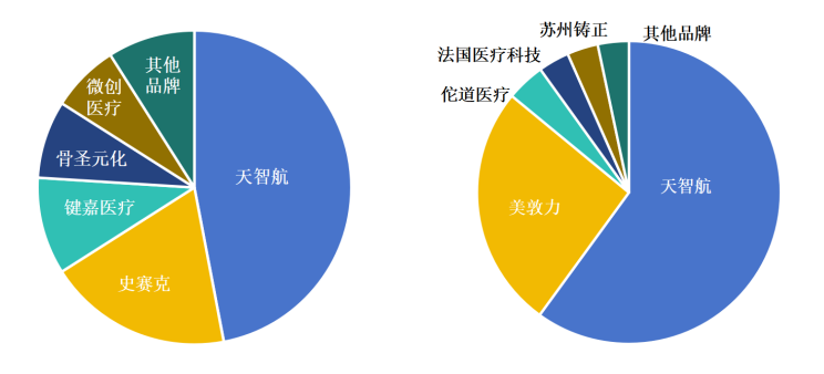 國內(nèi)累計獲批超50款,包括關(guān)節(jié)置換、脊柱外科機器人等,裝機量約200~300臺。其中,天智航天璣是國內(nèi)首款骨科機器人,部分性能比肩甚至超過進(jìn)口產(chǎn)品,可實現(xiàn)脊柱、關(guān)節(jié)、創(chuàng)傷手術(shù)全覆蓋,占據(jù)一半以上市場,手術(shù)應(yīng)用量已超過11萬例;史賽克、美敦力分別于2018年、2021年進(jìn)入中國市場,依托動態(tài)穩(wěn)定性、力反饋精度和AI輔助決策等技術(shù)優(yōu)勢分別發(fā)力關(guān)節(jié)和脊柱領(lǐng)域,約占國內(nèi)20%市場;佗道醫(yī)療、鍵嘉醫(yī)療等新興企業(yè)依托多術(shù)式、場景適配等優(yōu)勢加快入院。